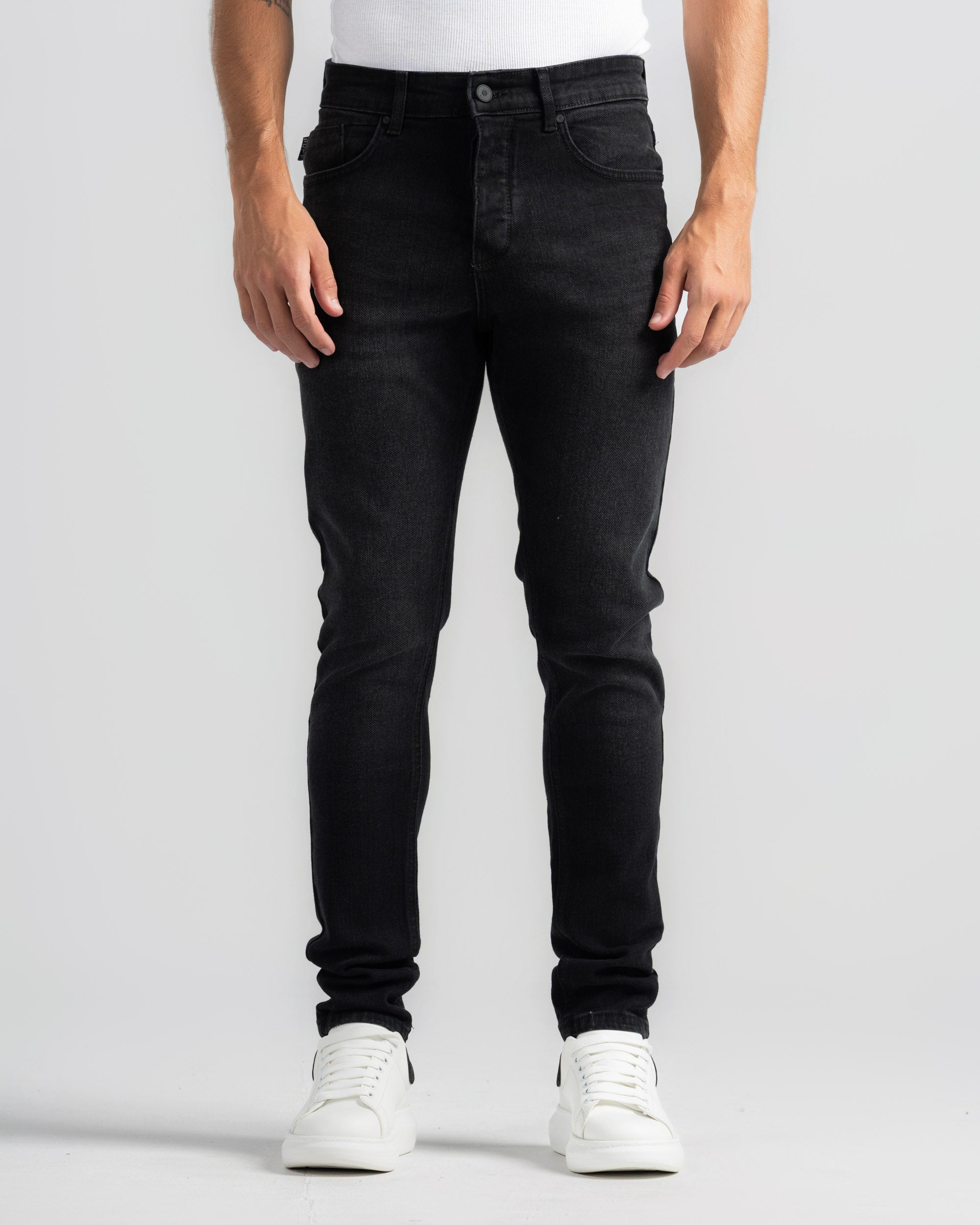 بنطلون جينز بقصه ضيقه، بخمسة جيوب، بتأثير باهت وأزرار للإغلاق.
