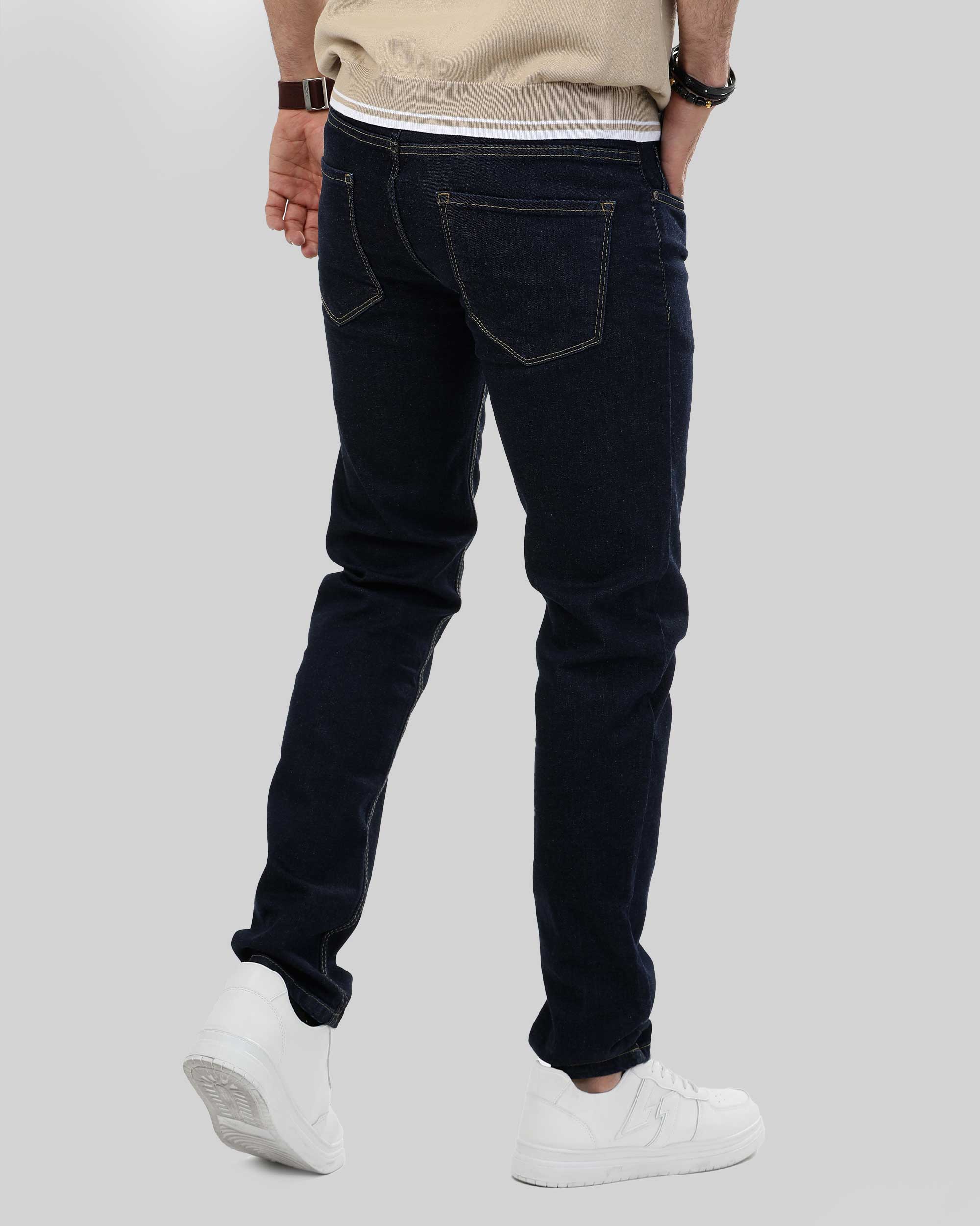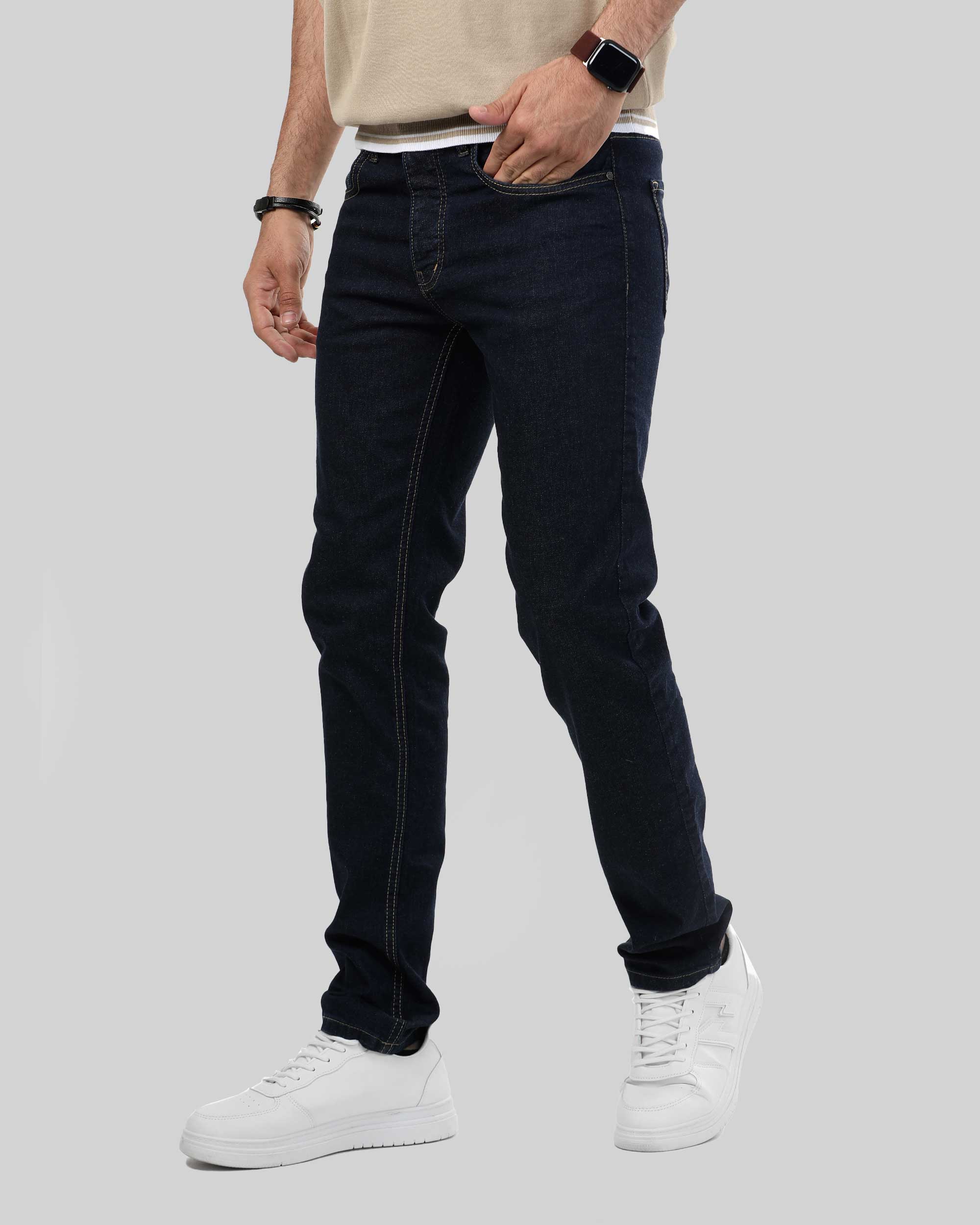 بنطلون جينز بقصه ضيقه وخمسة جيوب وأزرار للإغلاق.