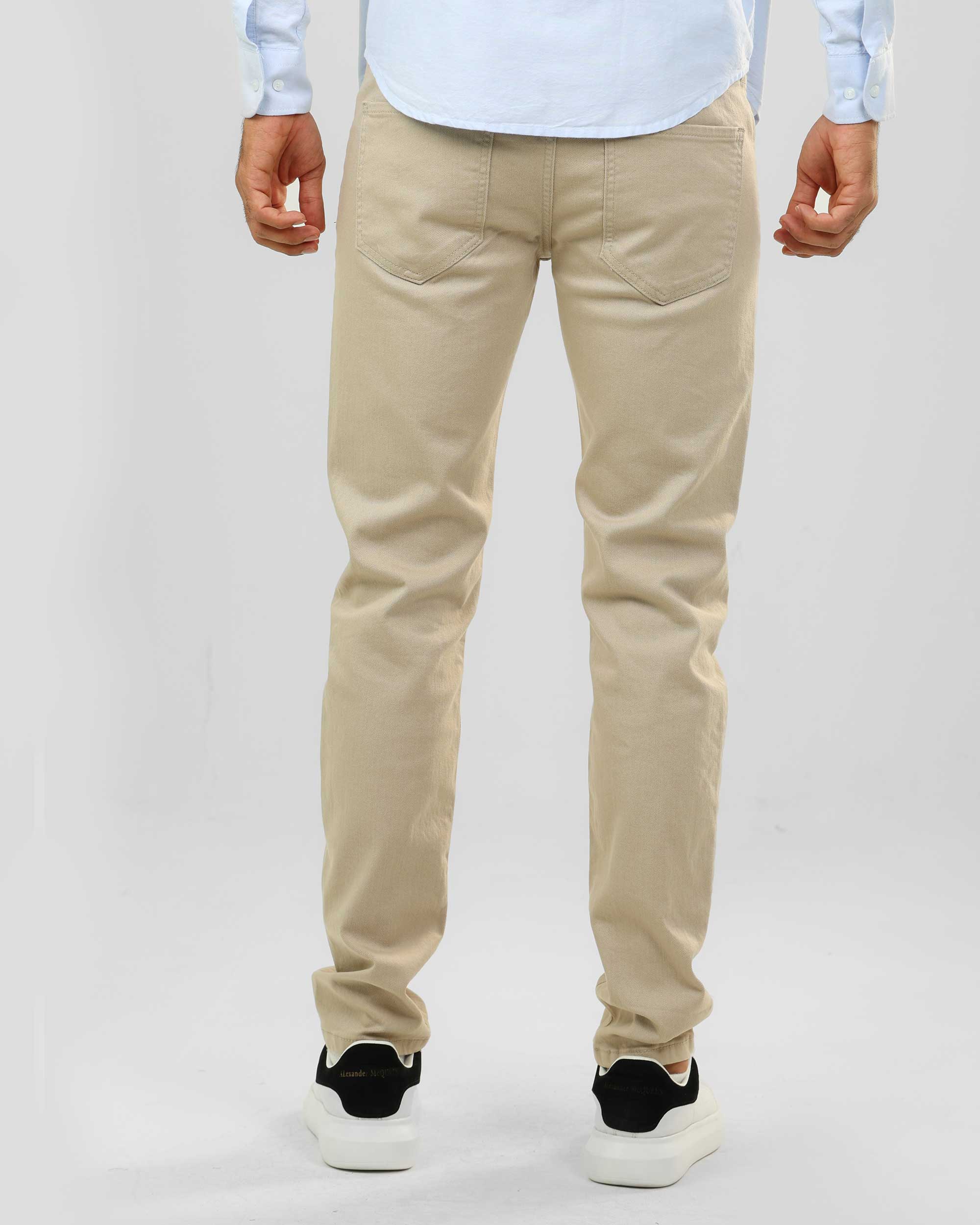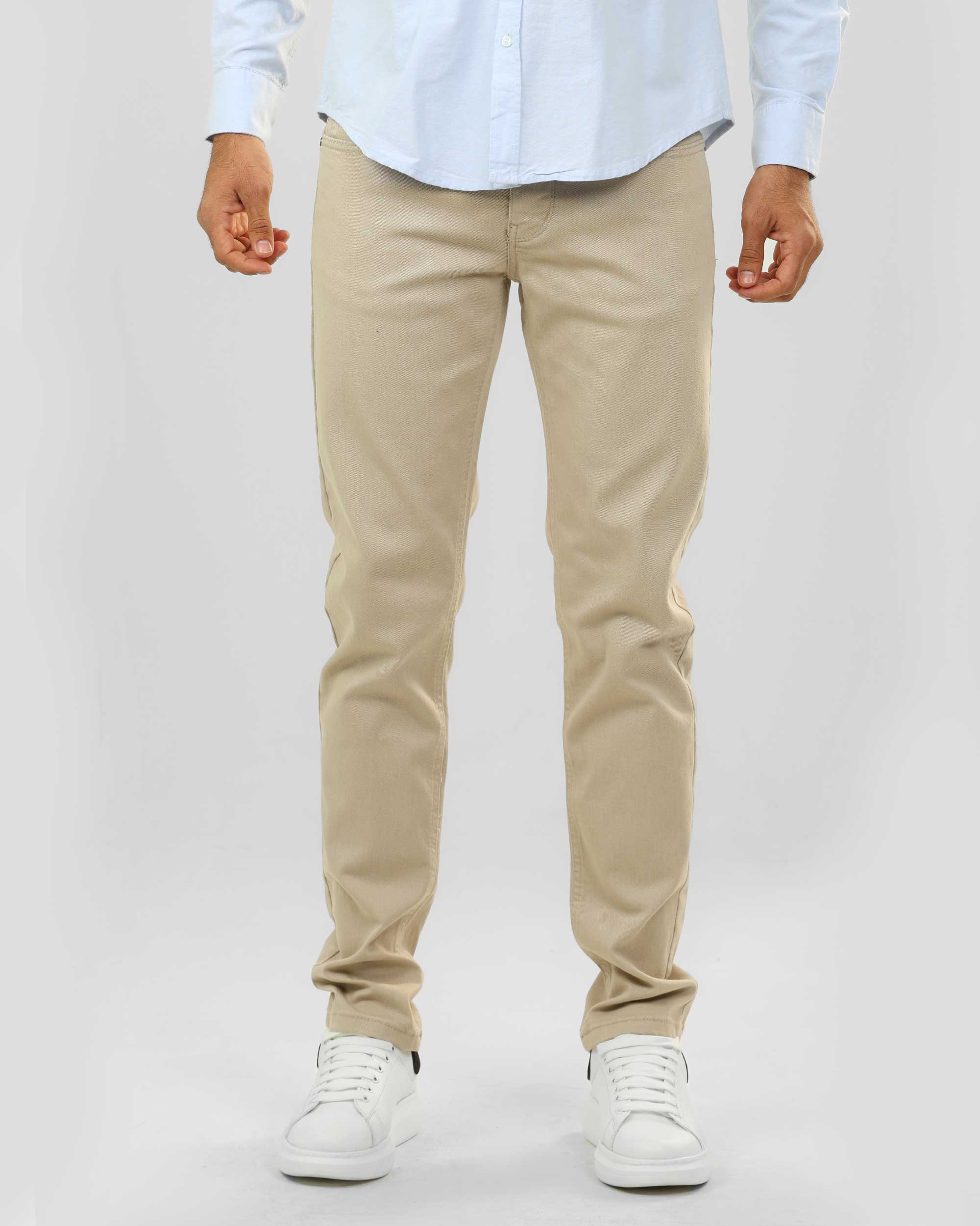 بنطلون جبردين بقصه ضيقه وخمسة جيوب وأزرار للإغلاق.