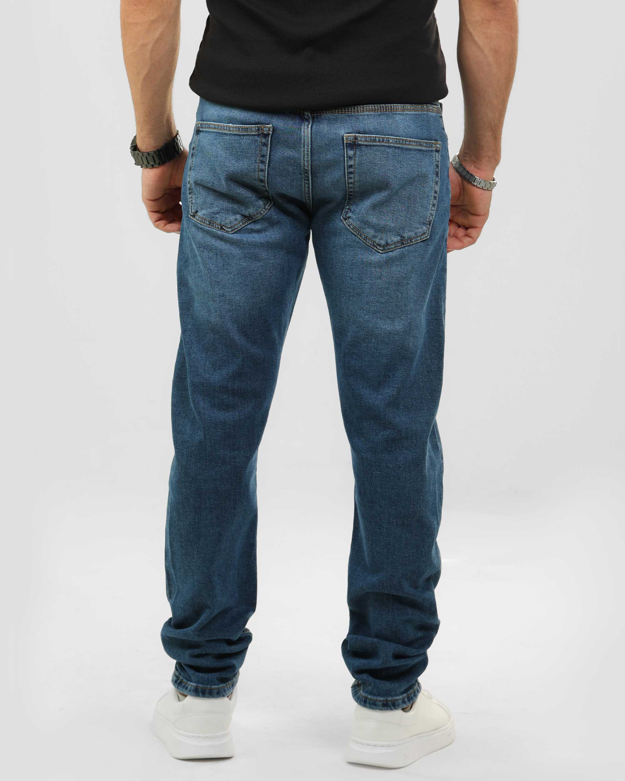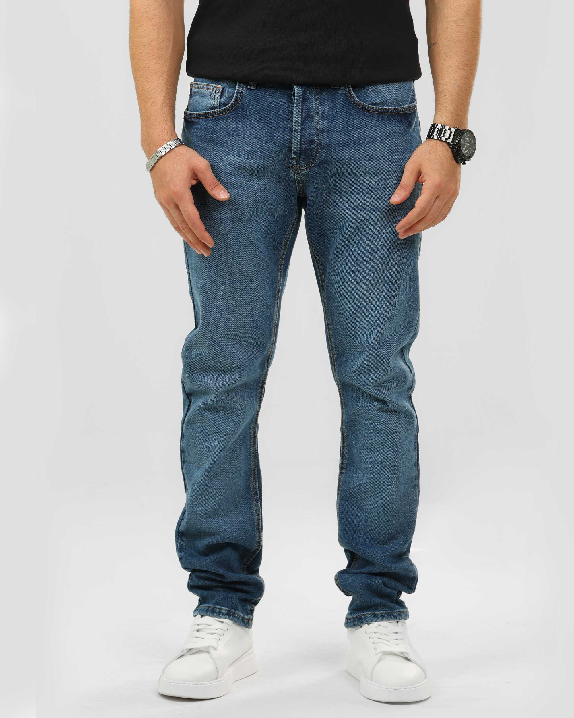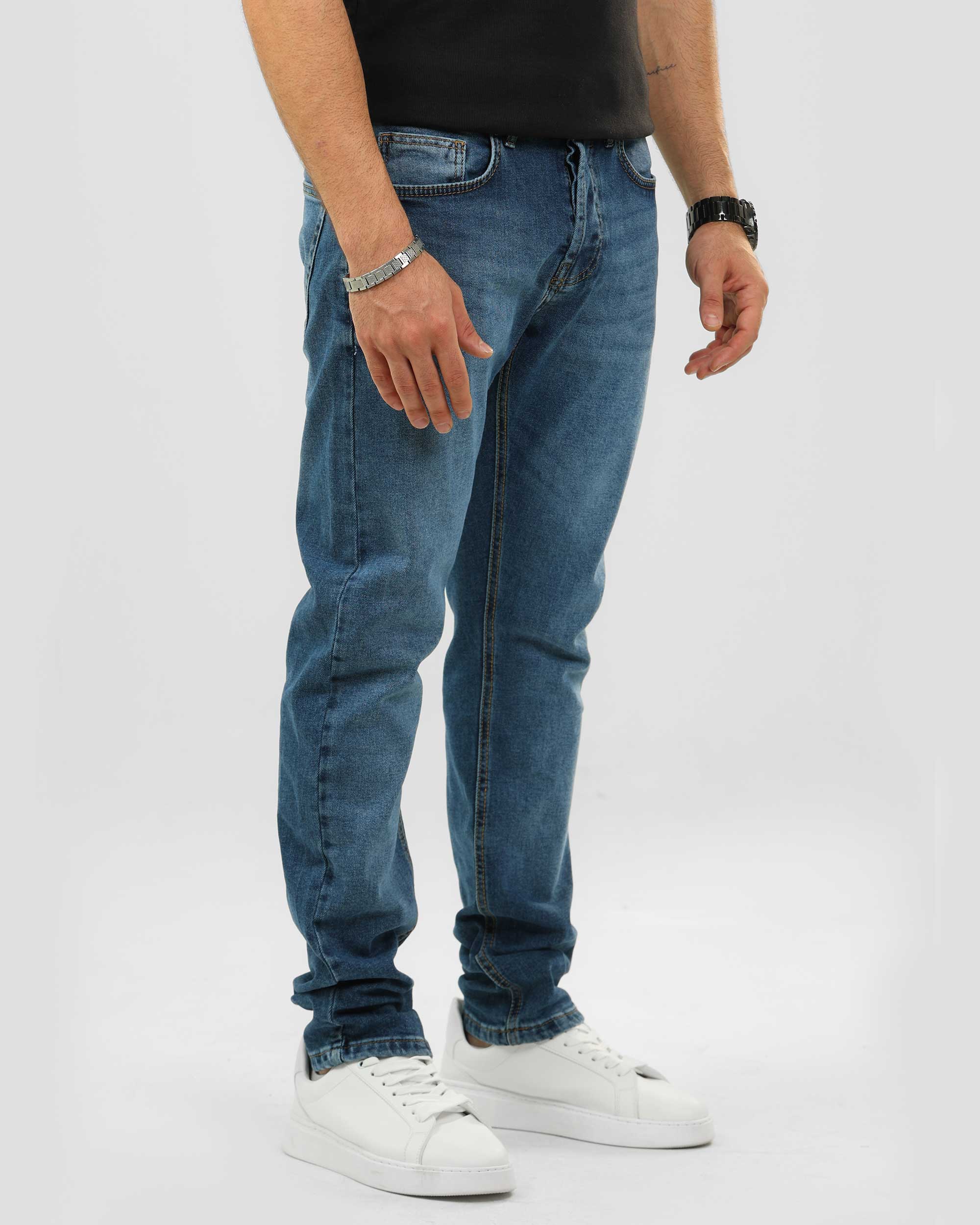 بنطلون جينز بقصه ضيقه وخمسة جيوب وتأثير باهت