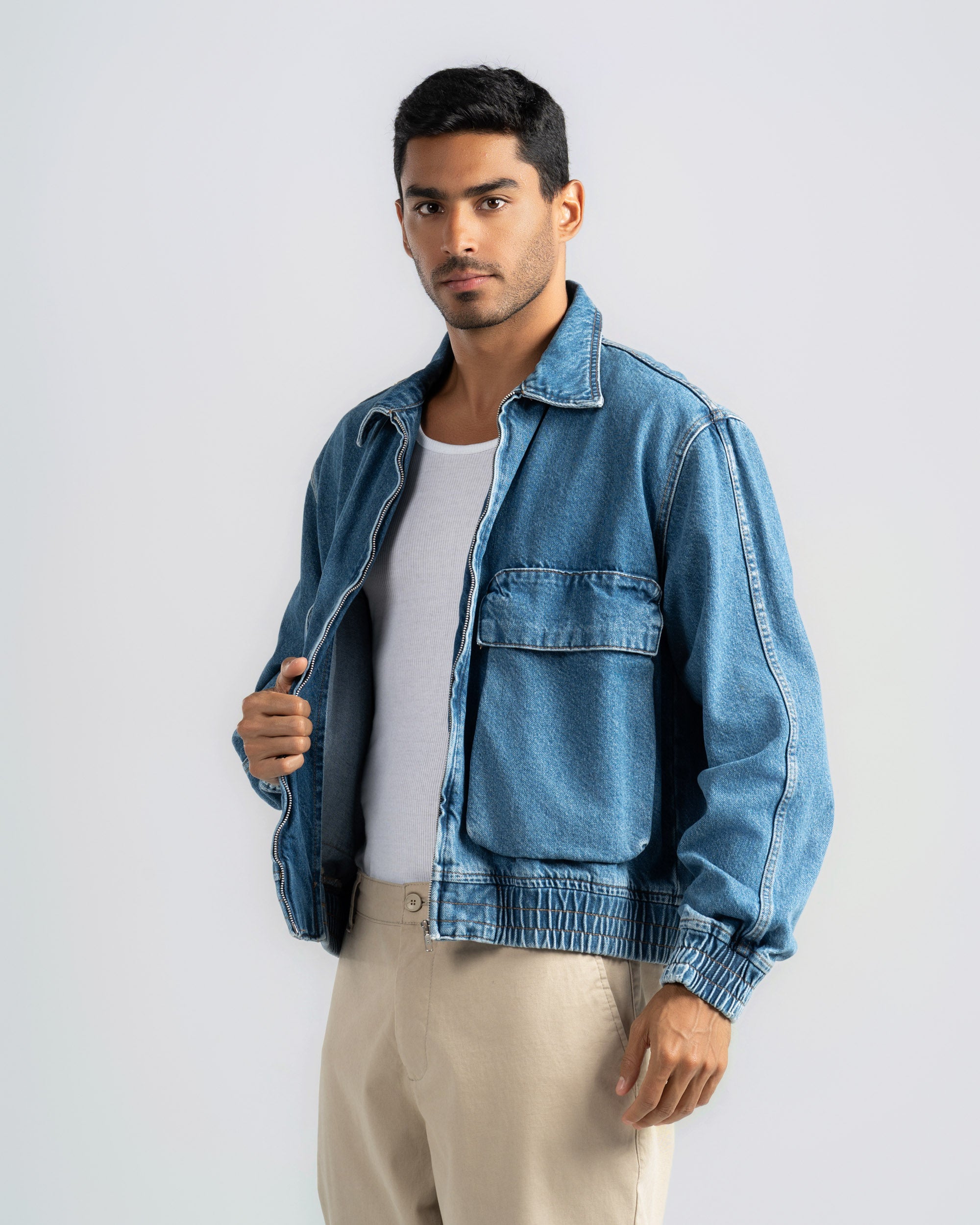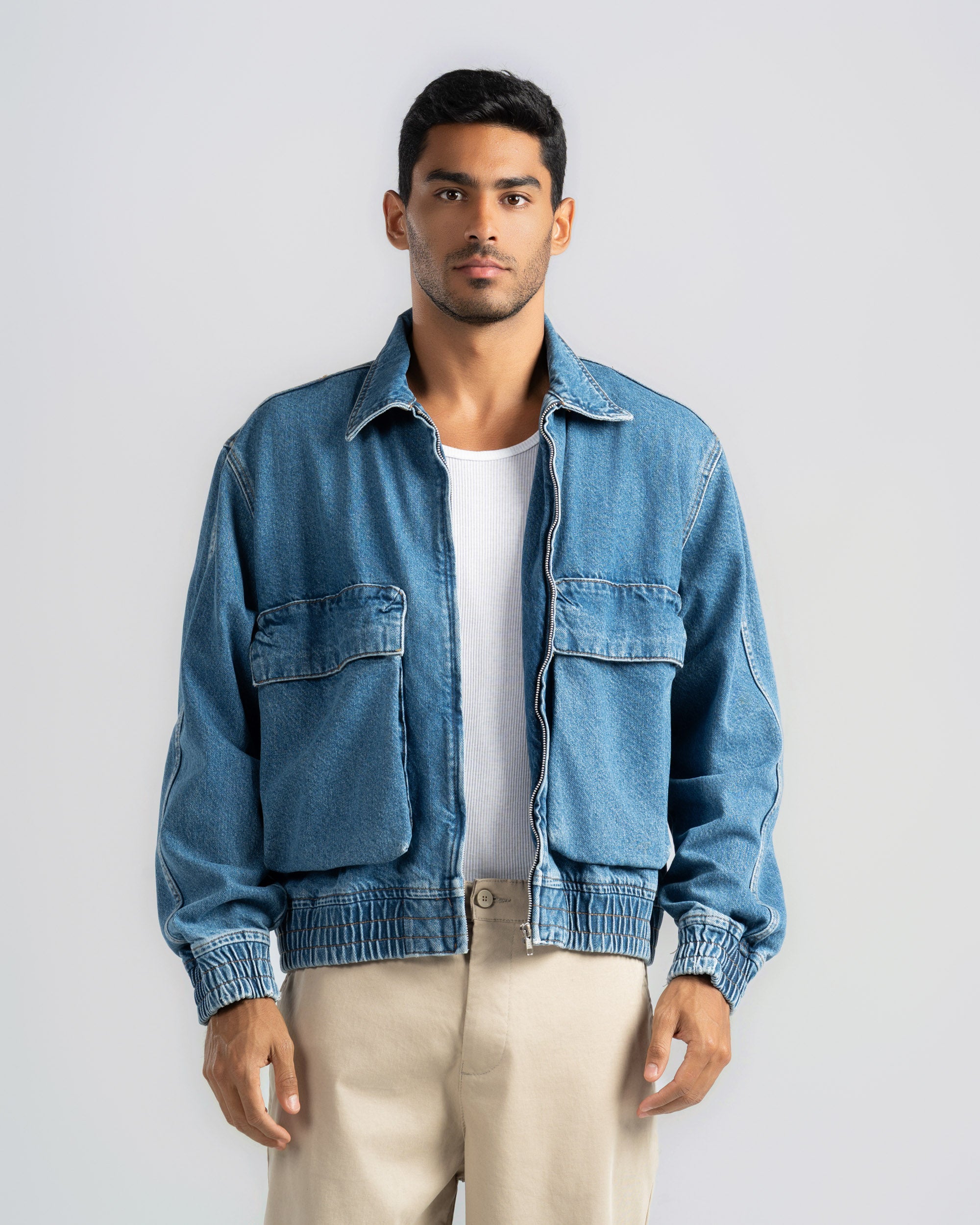 A trendy and comfortable denim jacket with a front zipper and two pockets. Perfect for winter and adds a stylish touch.