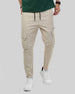 Trousers with an elastic waistband and adjustable drawstrings. made of soft gabardine fabric. Featuring front pockets and rear welt pockets and patch pockets with flaps on the legs