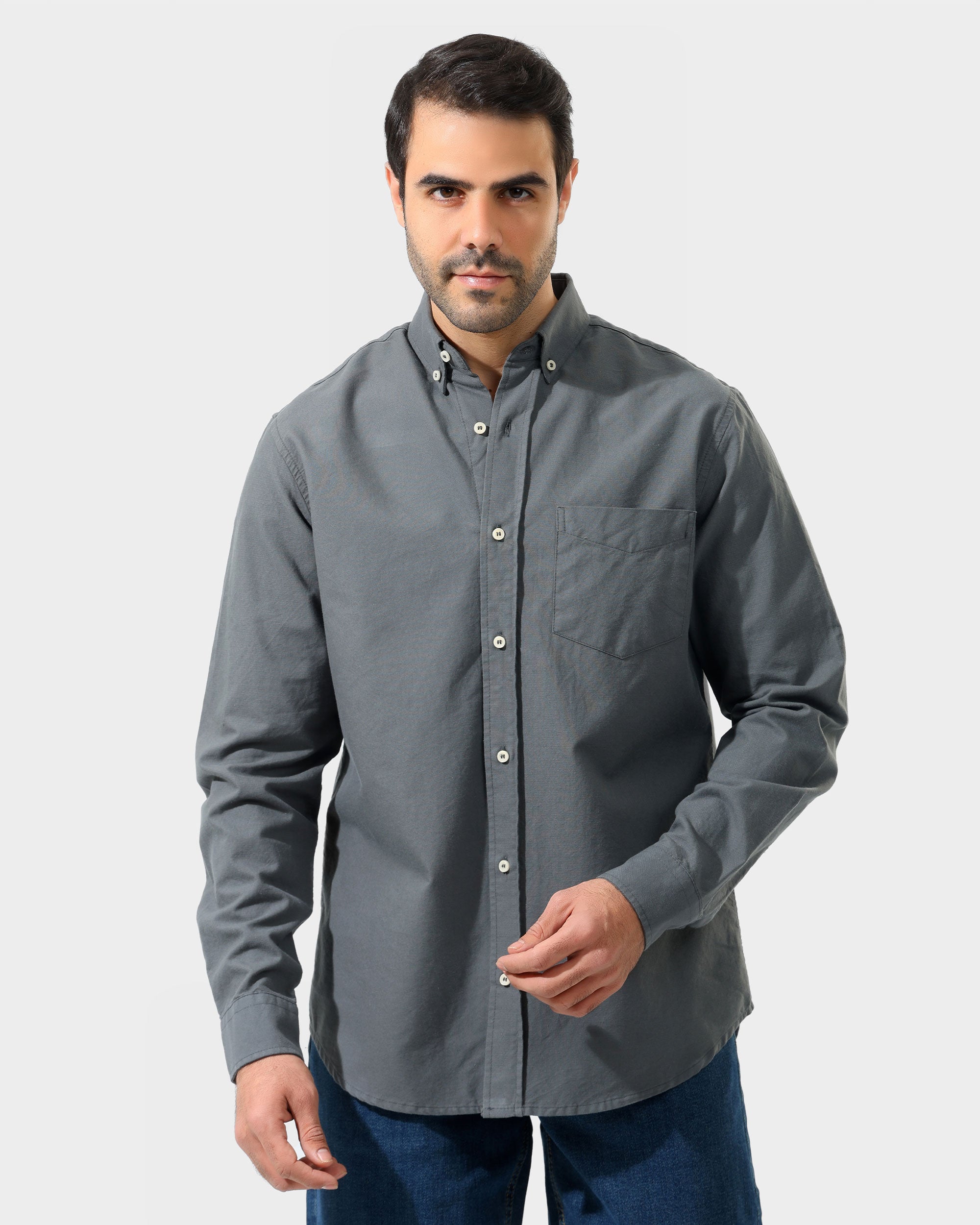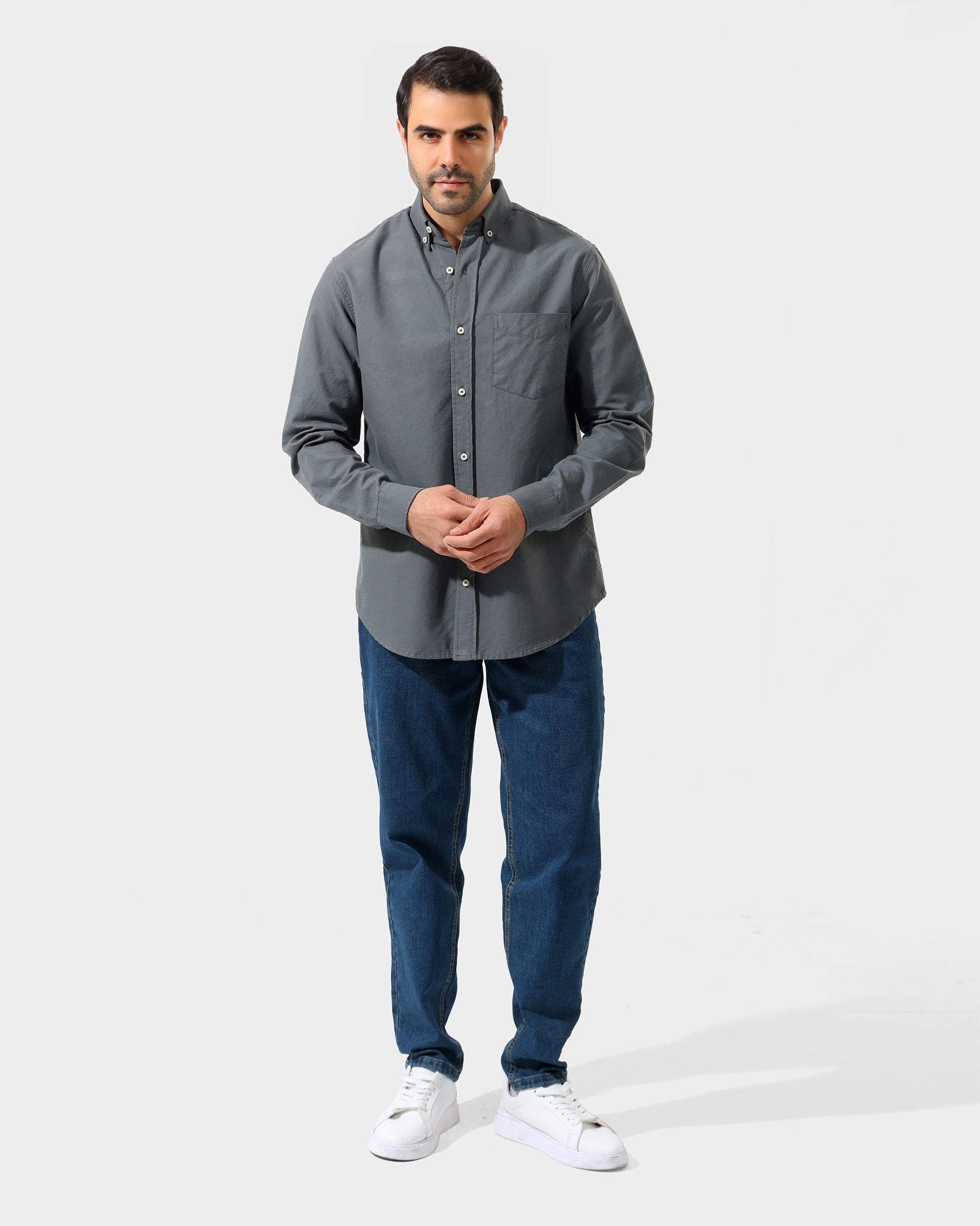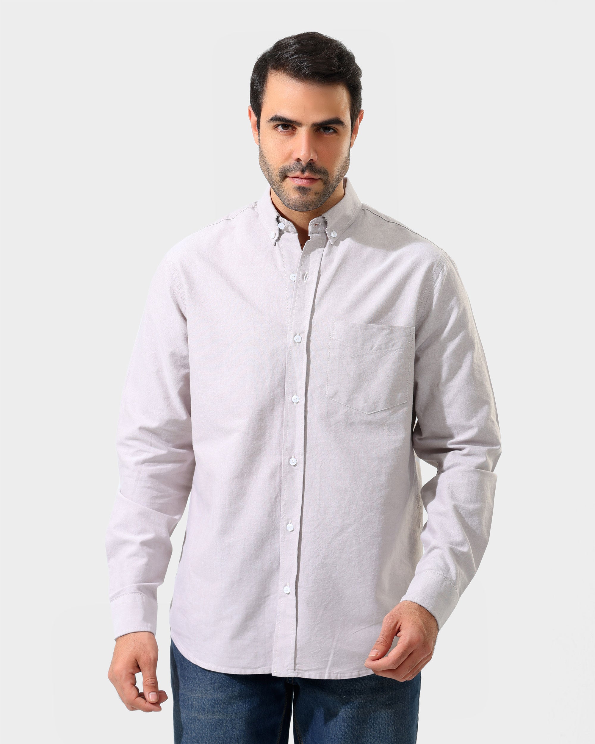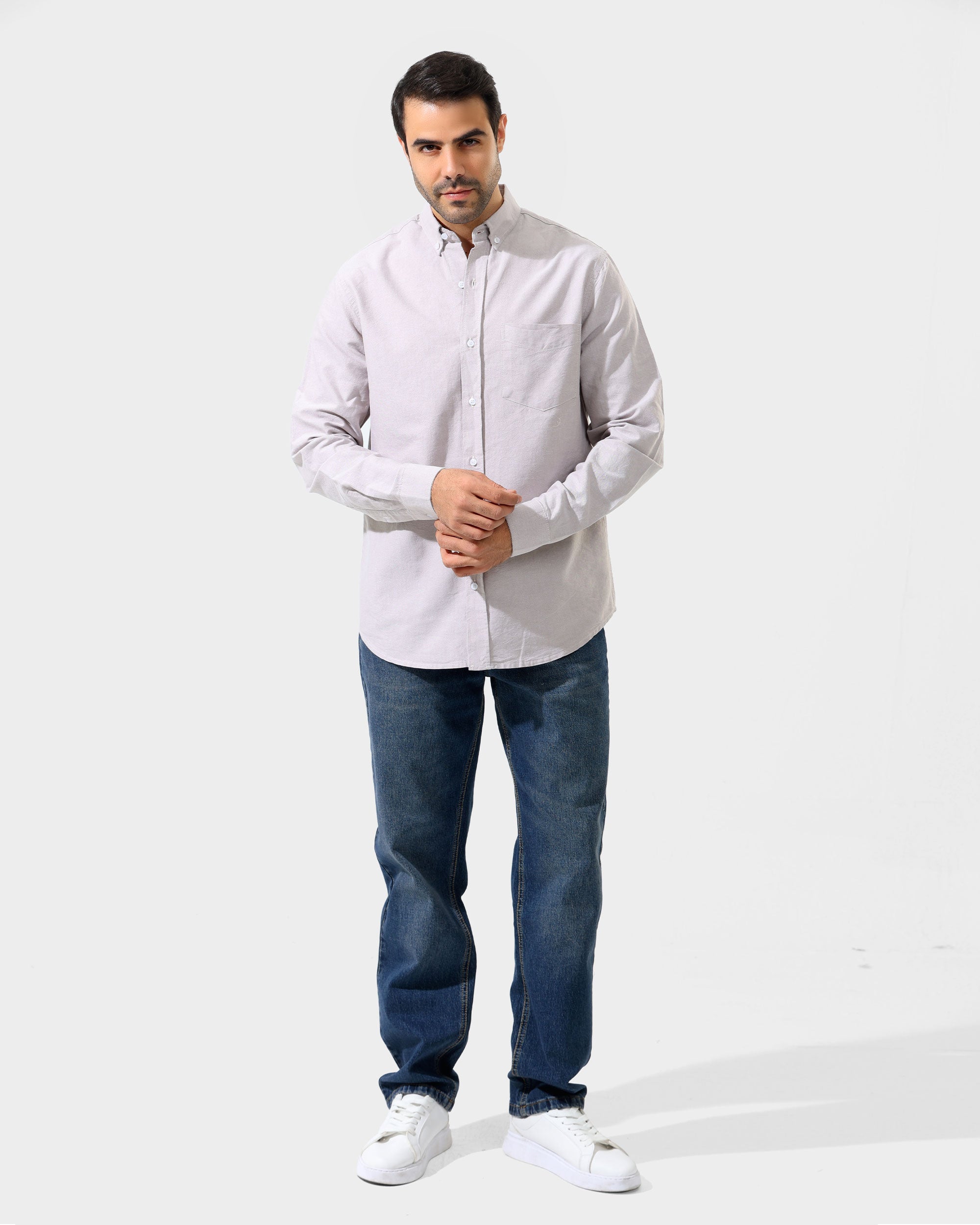 Regular fit shirt featuring a buttoned collar and long sleeves with buttoned cuffs. Button-up front.