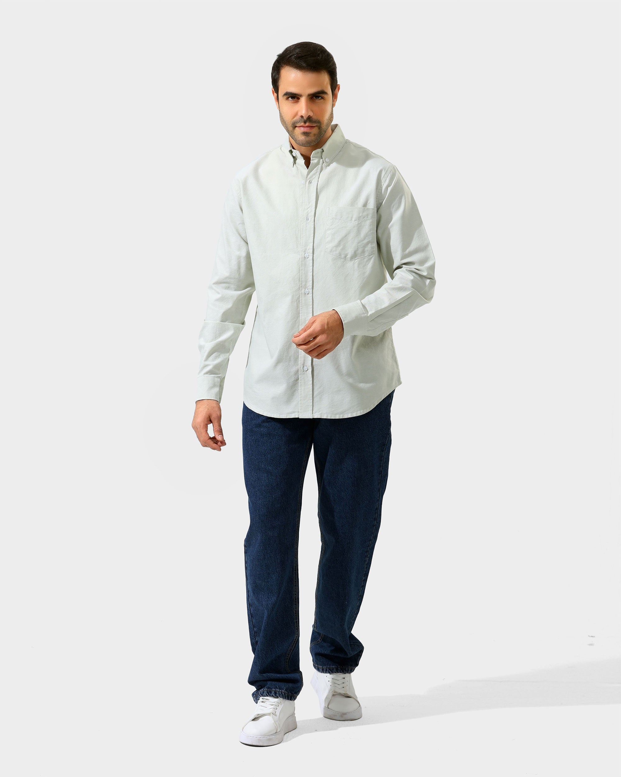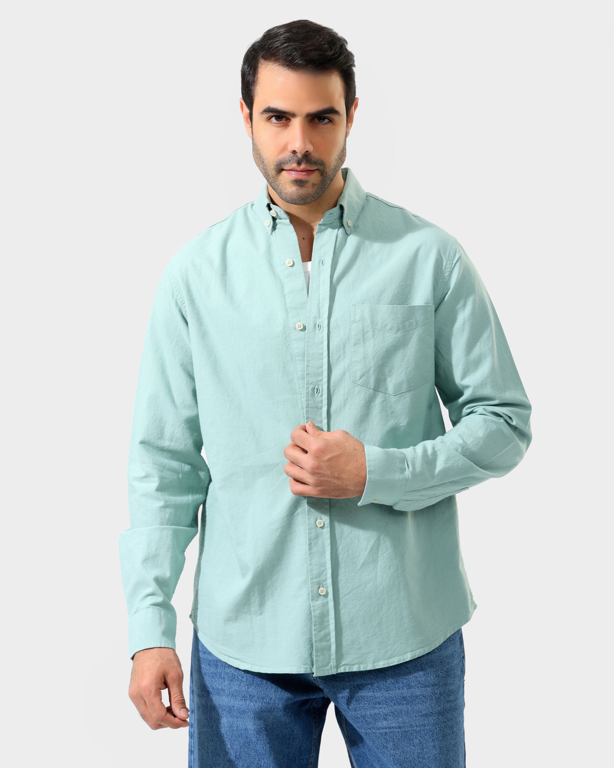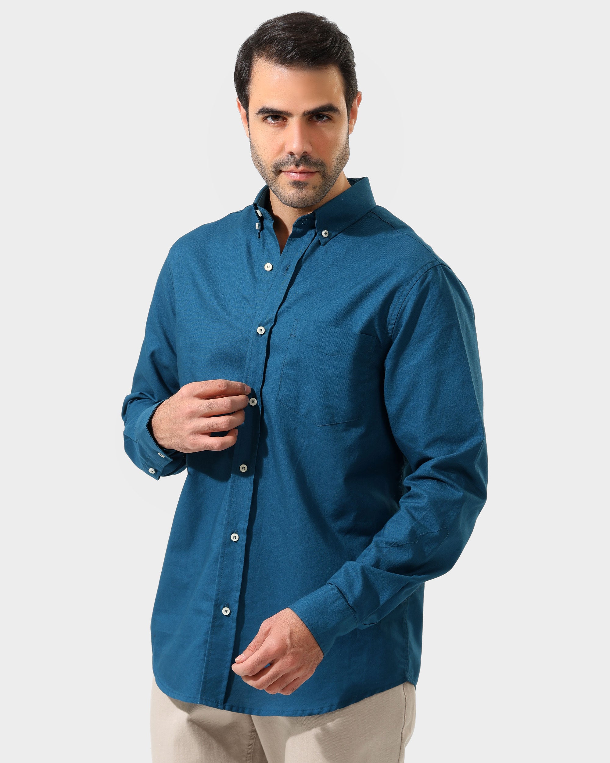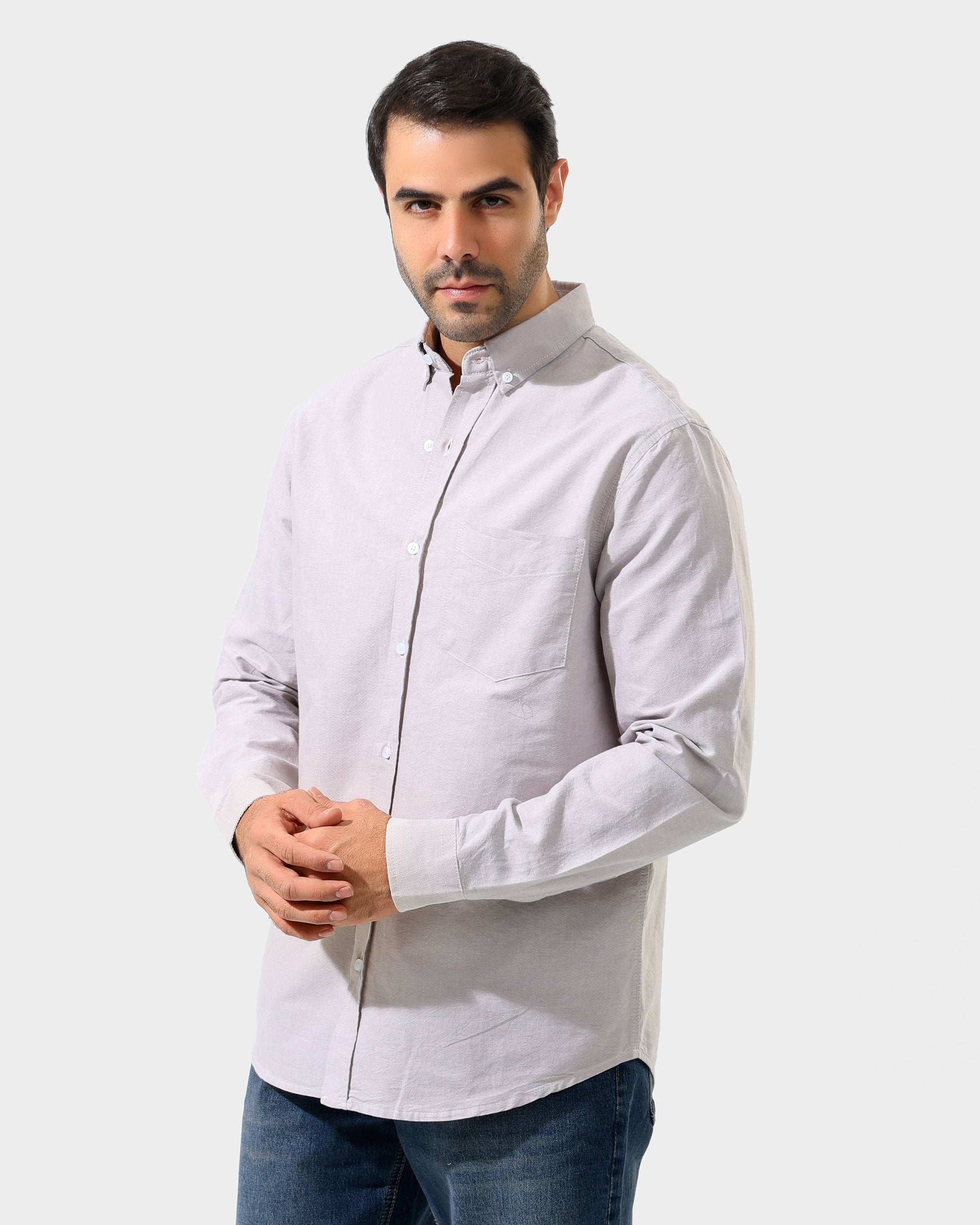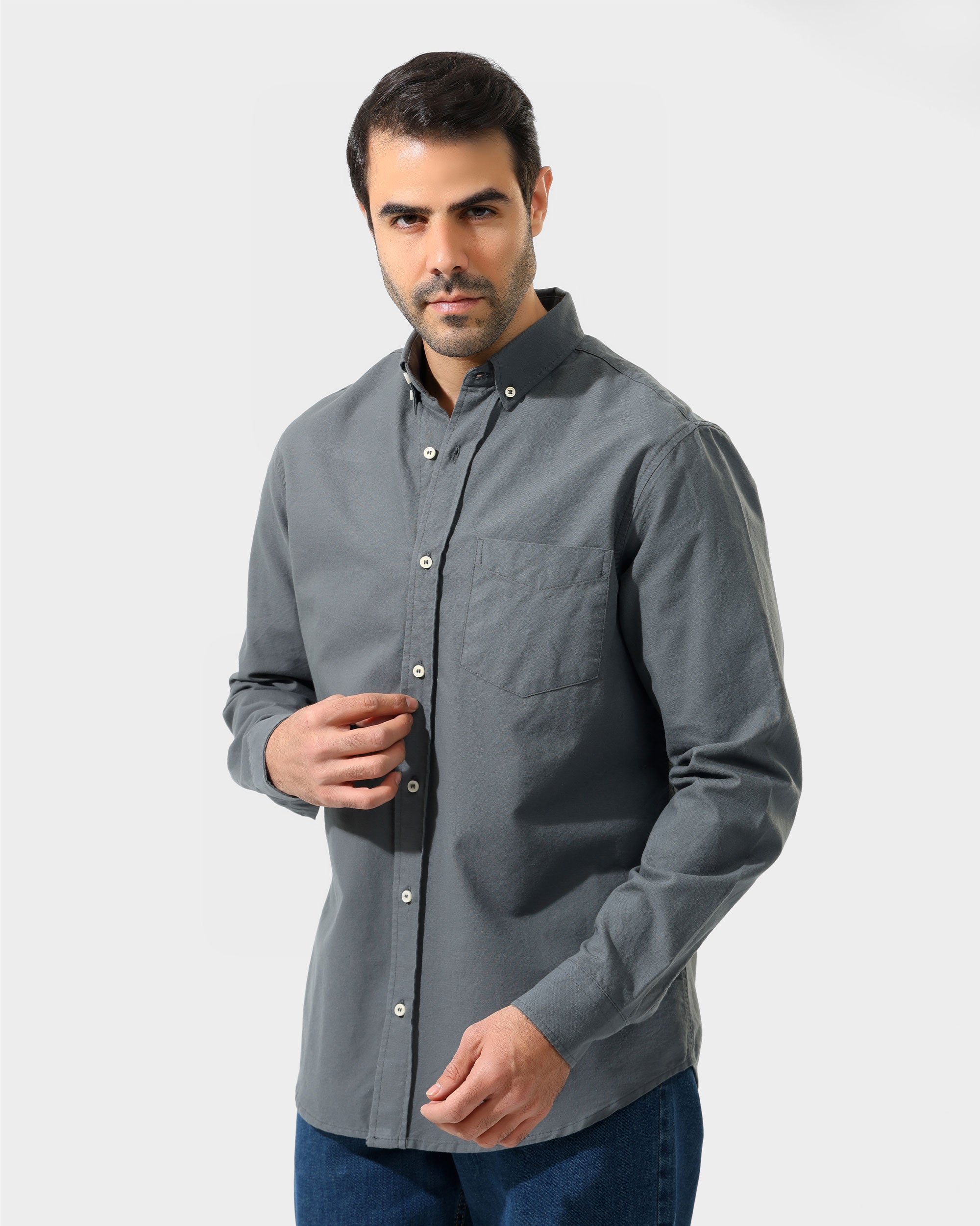 Regular fit shirt featuring a buttoned collar and long sleeves with buttoned cuffs. Button-up front.
